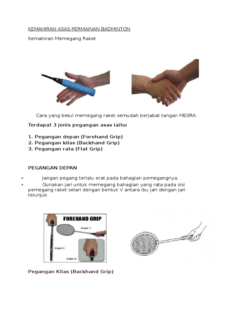 Badminton dipercayai berasal dari India yang dikenali sebagai permainan poone poona. Permainan badminton merupakan permainan yang sifatnya individual yang bisa dilakukan dengan cara satu lawan satu ataupun dua lawan dua dalam materi badminton atau bulutangkis ini menggunakan alat yang bernama raket sebagai pemukul dan kok yang menjadi objek pukulnya. Kemahiran memegang raket.
