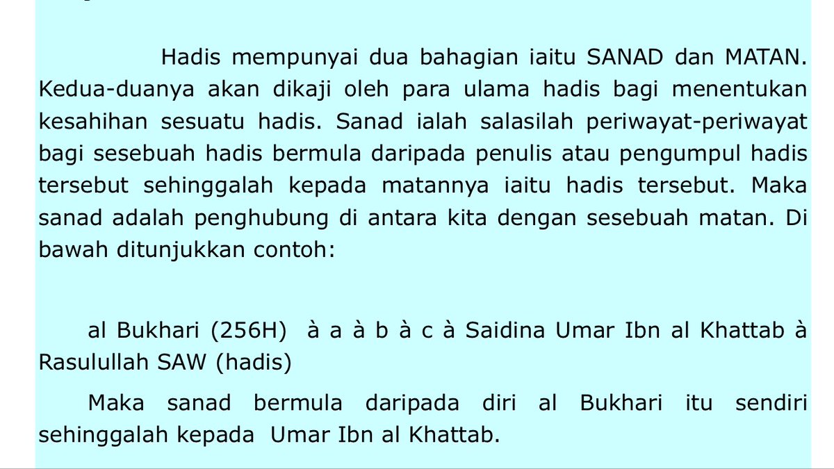 Setiap hadis berdasarkan kepada dua bahagian rantaian penyampai hadis yang melaporkan isnadnya dan teks itu sendiri matn. Hadith Hasan Shahih.