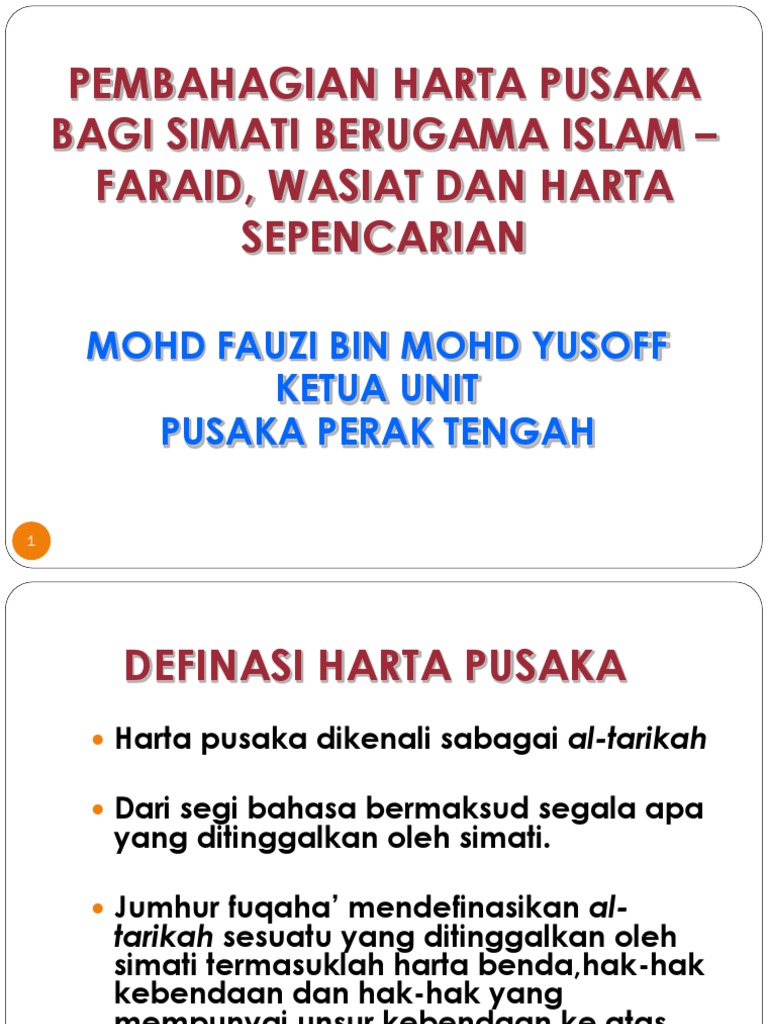 Ilmu Perancangan Harta Pembahagian Faraid Bagi Harta Pusaka Pasangan Suami Isteri Yang Mati Serentak. Ia diperoleh daripada seseorang yang meninggal dunia dan meninggalkan waris yang layak menerima harta pusaka mengikut Hukum Syarak. Cara penolakan hak juga sebenarnya adalah hasil daripada persefahaman antara ahli warisContohnya.